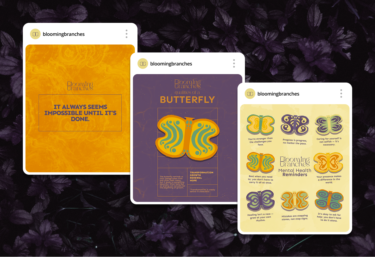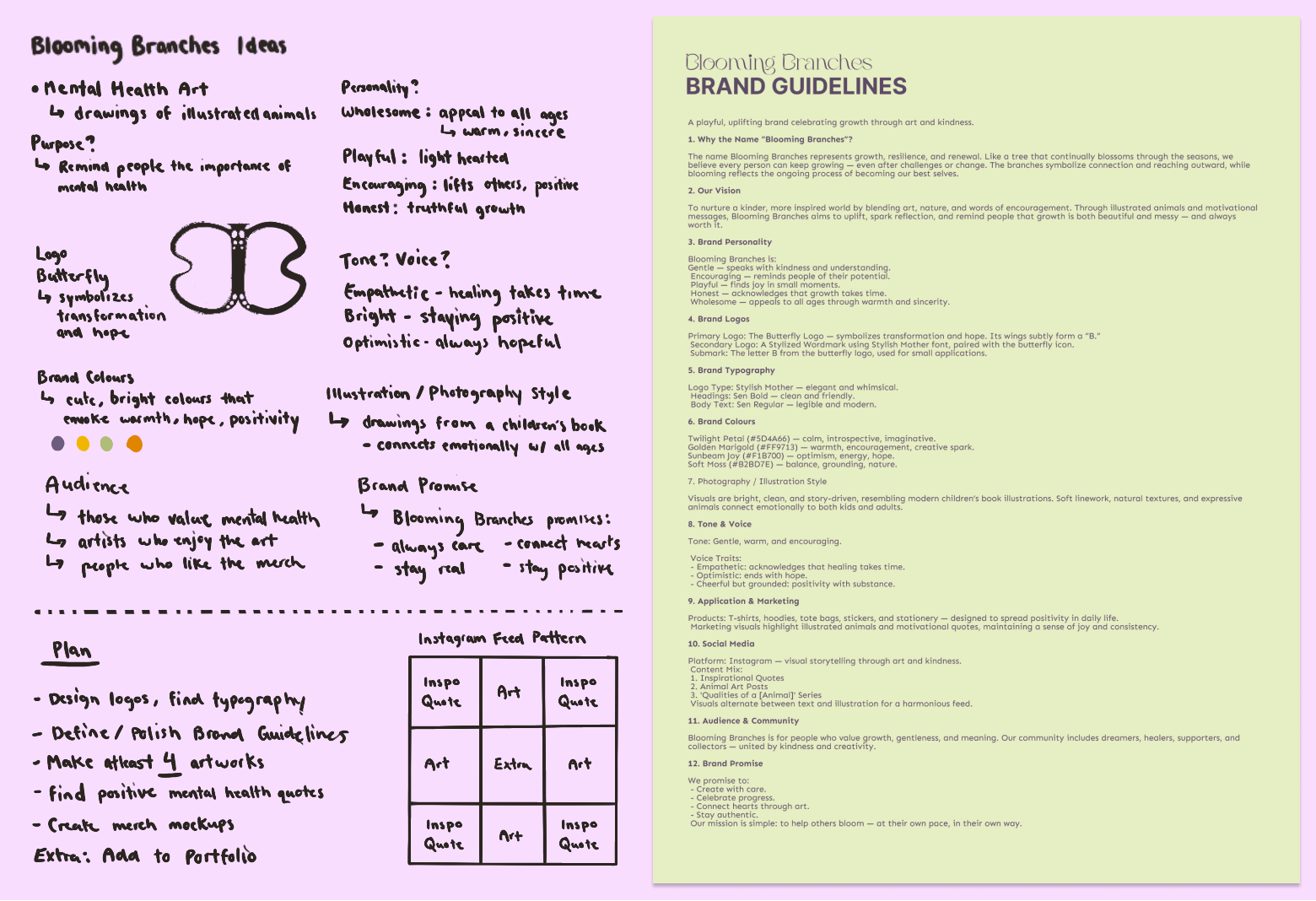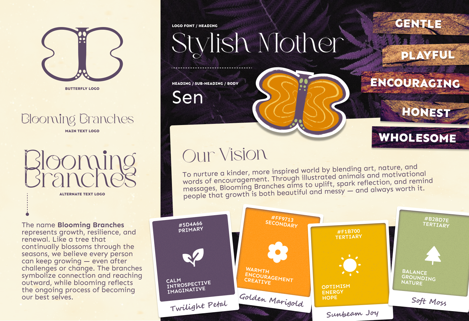 Blooming Branches is a mental health advocacy brand centered around healing, growth, and self-compassion. I developed a full brand identity that includes a logo inspired by a butterfly, symbolizing transformation and renewal. The project features illustrated quotes, social media posts, and merchandise mockups that blend nature and gentle encouragement. Through hand-drawn illustrations of animals, and a warm, nature-inspired color palette, Blooming Branches aims to remind people that growth takes time—and that it’s okay to rest, reflect, and bloom at their own pace.