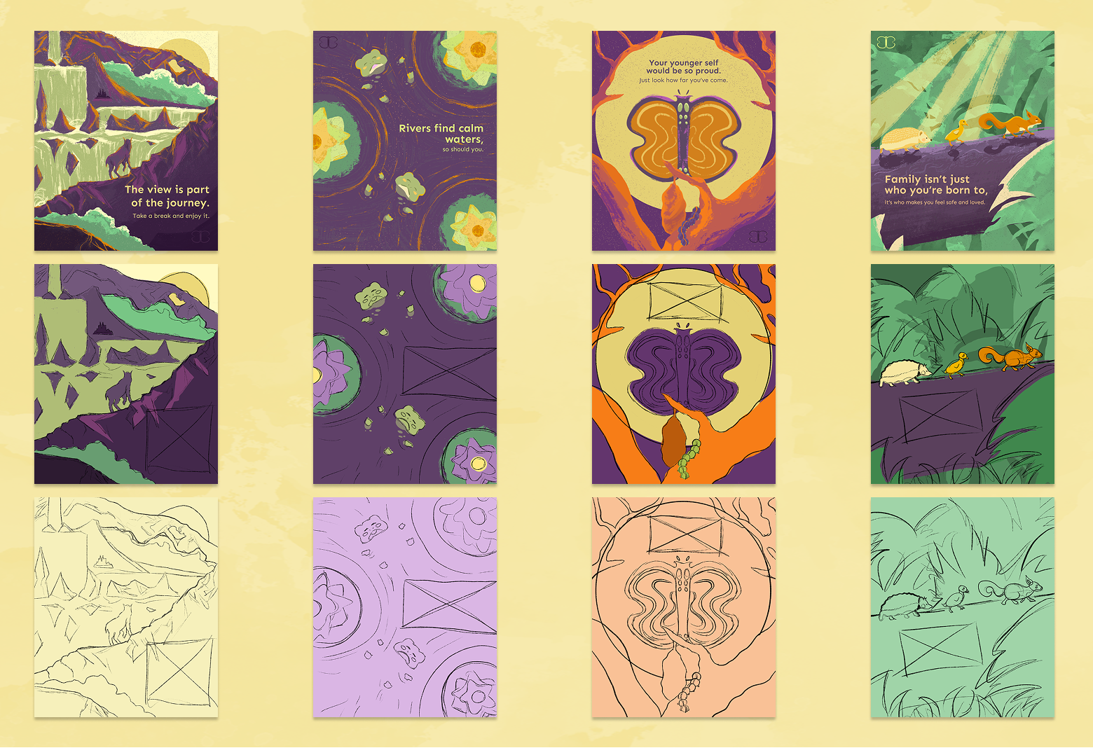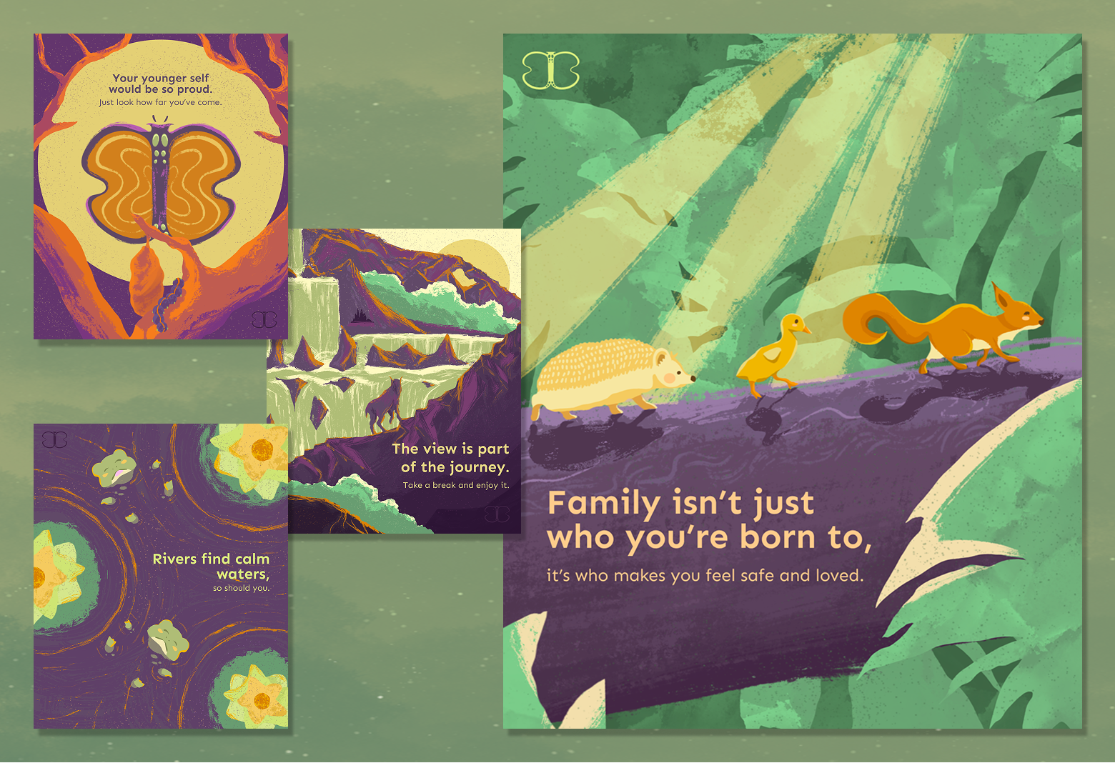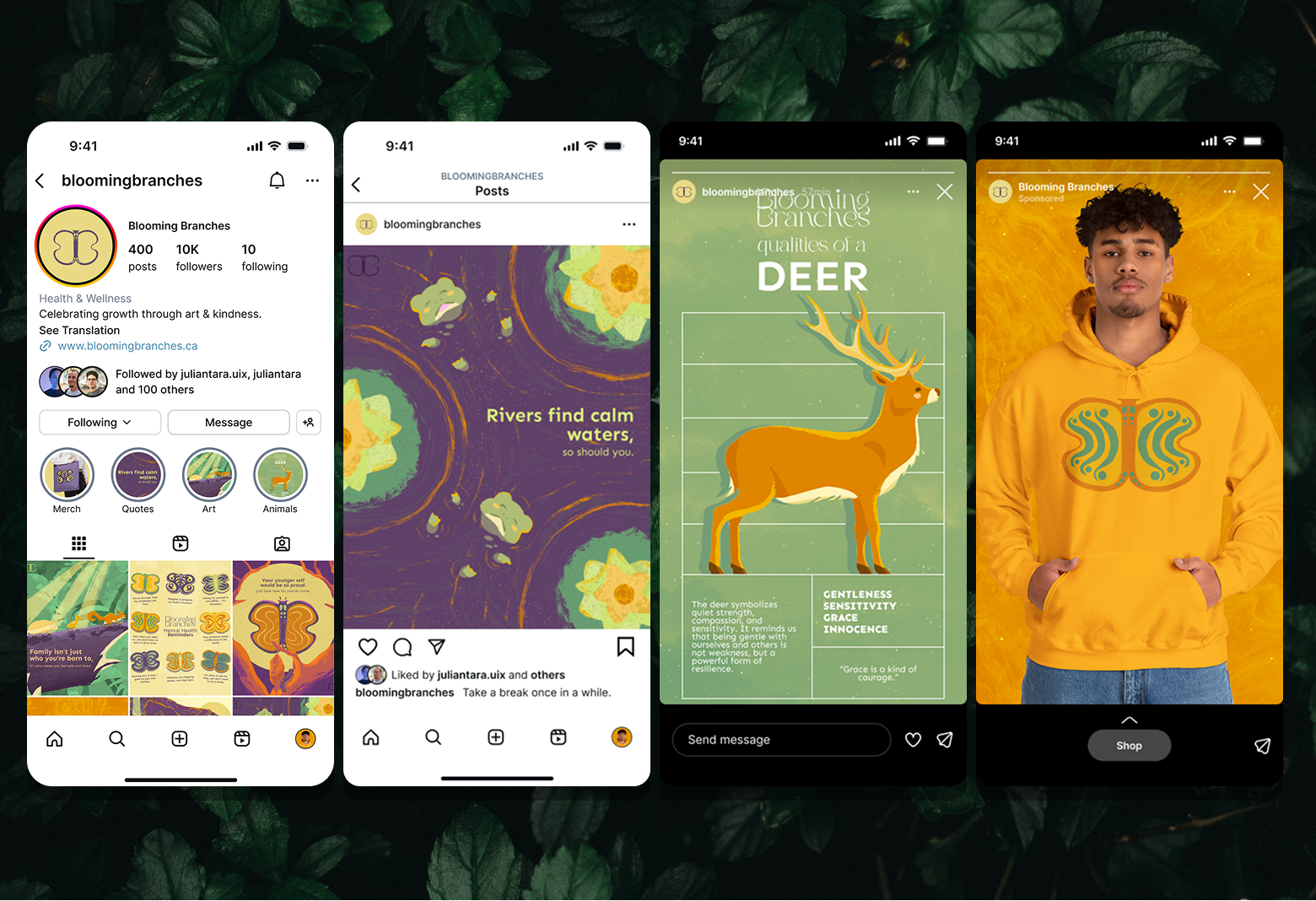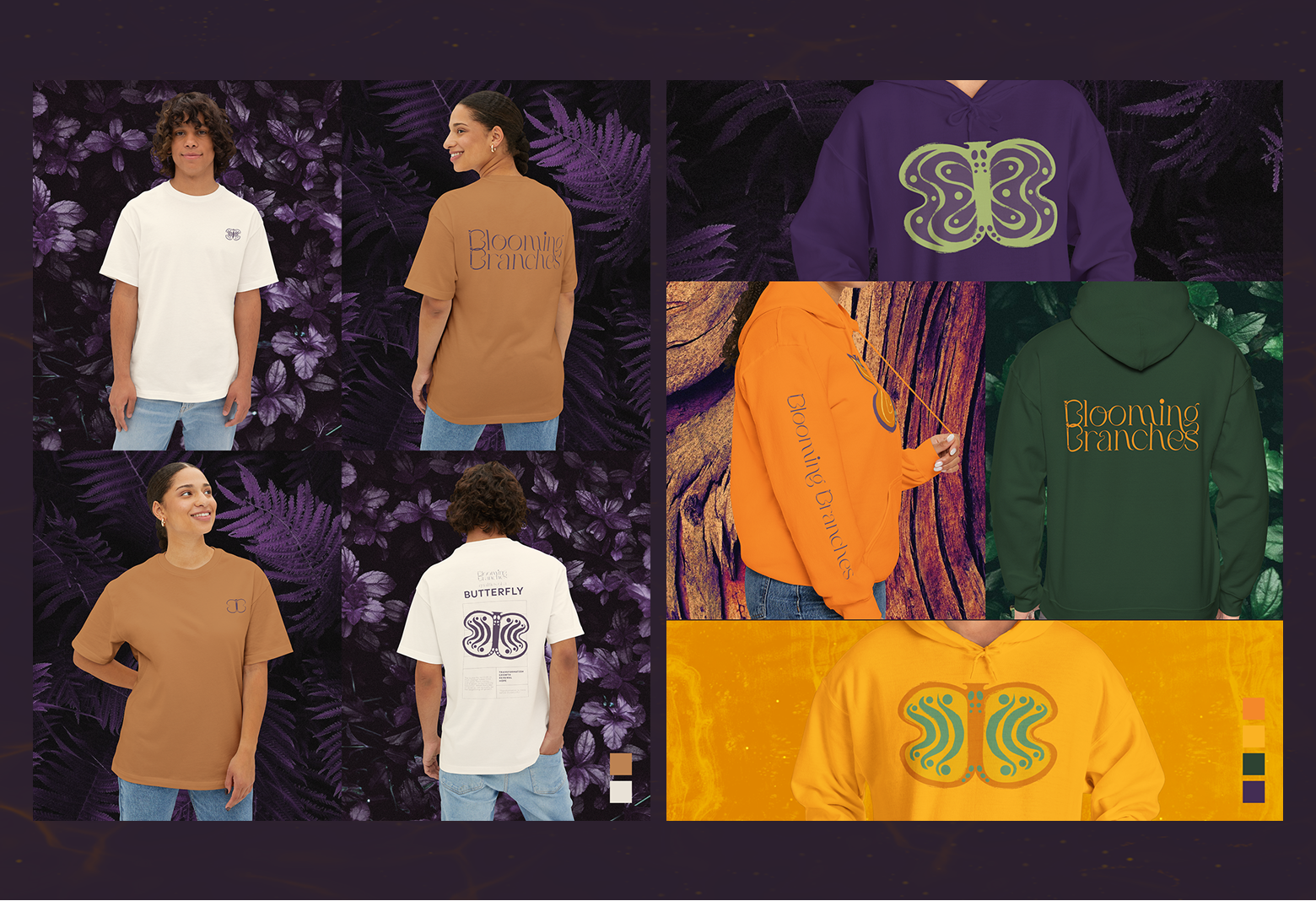Blooming Branches is a mental health advocacy brand centered around healing, growth, and self-compassion. I developed a full brand identity that includes a logo inspired by a butterfly, symbolizing transformation and renewal. The project features illustrated quotes, social media posts, and merchandise mockups that blend nature and gentle encouragement. Through hand-drawn illustrations of animals, and a warm, nature-inspired color palette, Blooming Branches aims to remind people that growth takes time—and that it’s okay to rest, reflect, and bloom at their own pace.